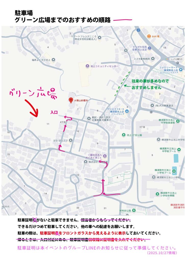 ※スクールゾーンのため、平日7:30〜8:30までは車両通行できません。Bのルート地図をご参考ください。アースデイ当日は祝日なので、通行可能です。(2025.10/27の情報)