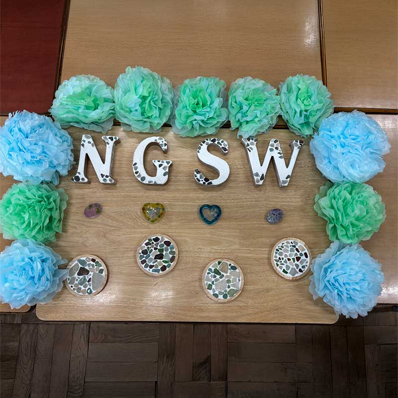 〈ステージづくり・シーグラス〉長沢中学校3学年です。環境のことを考えながら、中央委員のSリーダーが中心となりシーグラスを使った小物を製作しました。